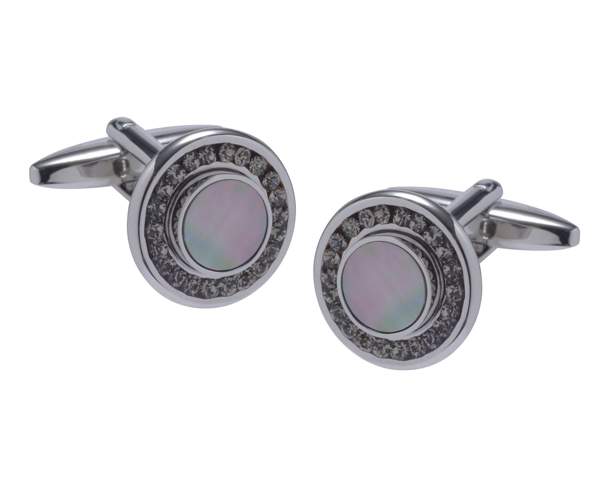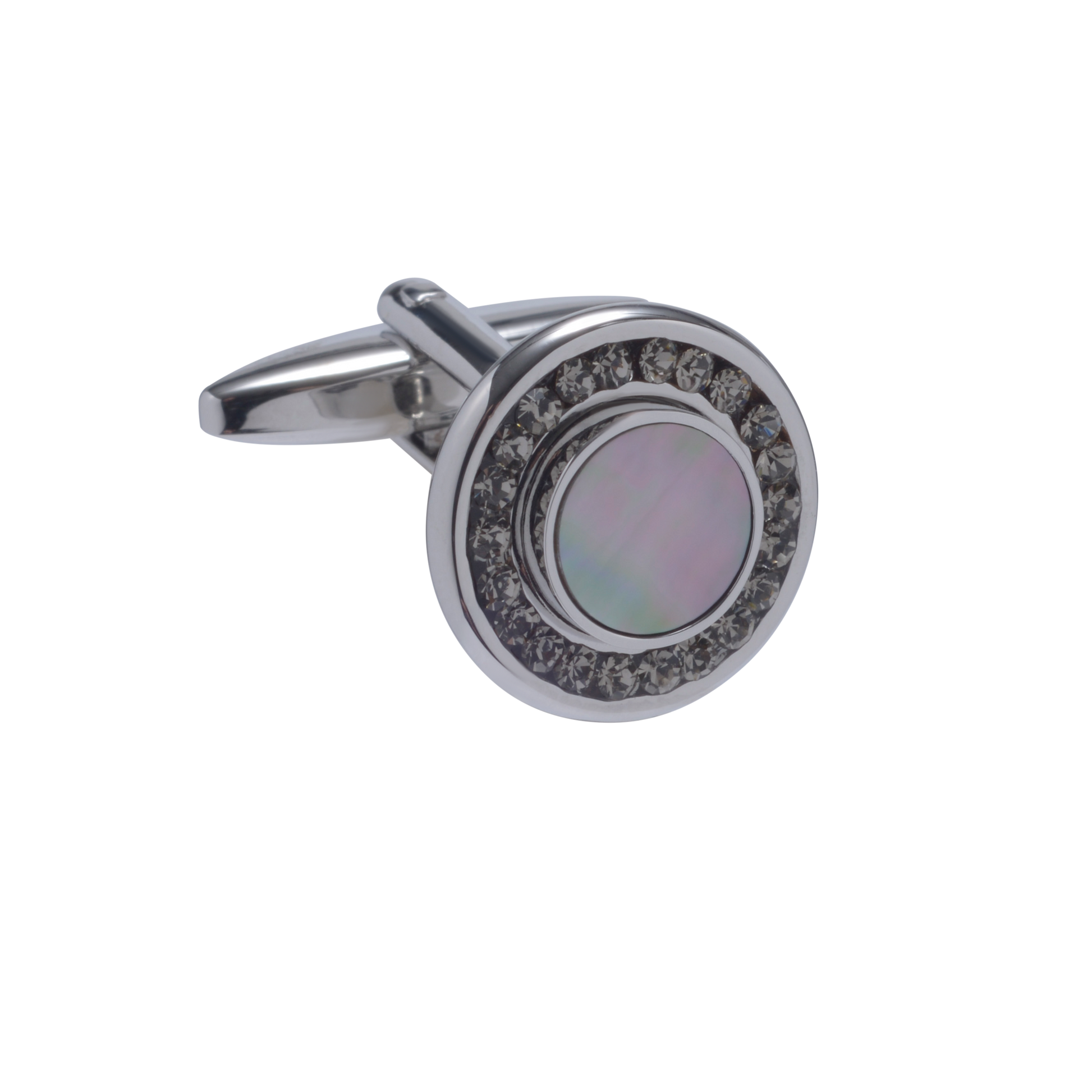 A stunning round cufflink with crystal detail that will shine all night. A smokey mother of pearl centre is surrounded by a band of smouldering grey crystals for a unique twist to the cuff. An unexpected black-tie hero.