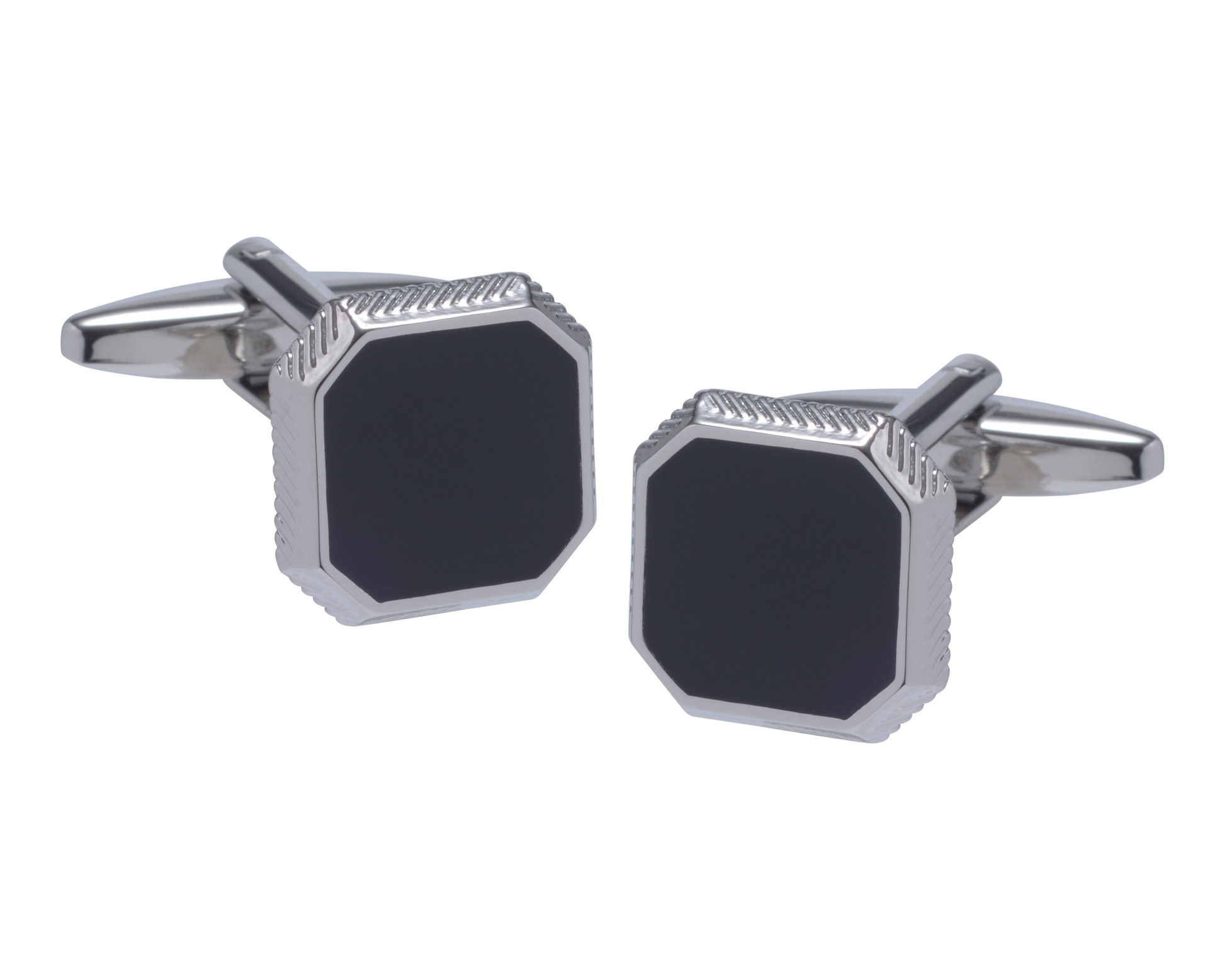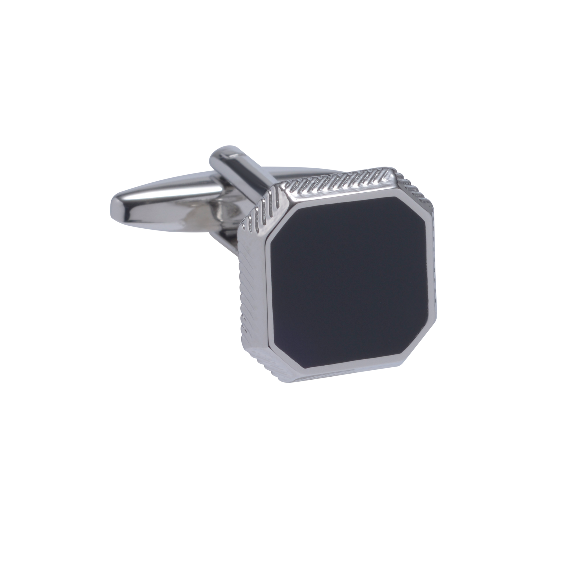 A unique refined octagon cufflink with an inky black enamel inset and textured edging. This sophisticated design offers versatility to every formal wear accessory wardrobe. Perfect for weddings, black tie and beyond.