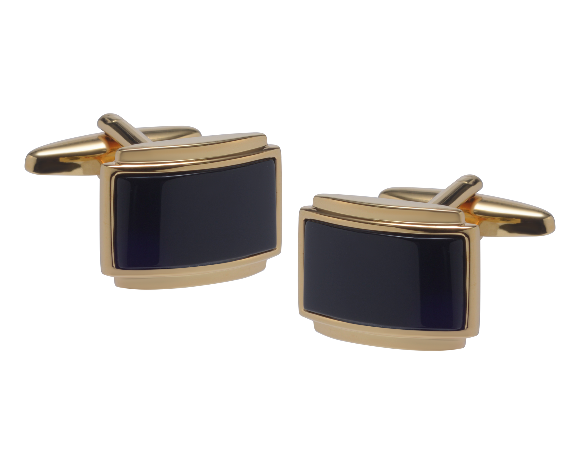 This gold-plated rectangle cufflink sees a classic onyx stone set into a slightly curved rectangular shape & finished off with a small plinth inspired by traditional carpentry techniques seen in British stately homes. Featuring at the top and bottom, this details frames and adds interest to this subtle traditional design.