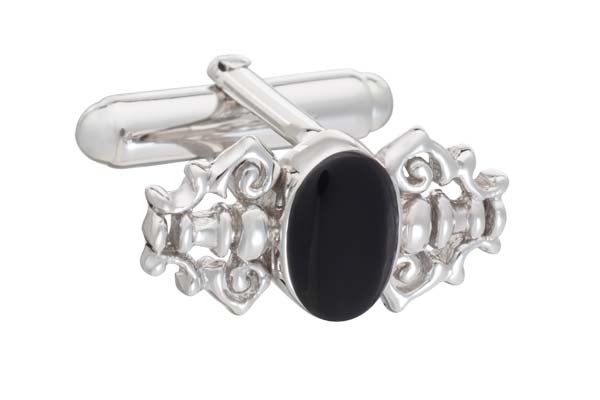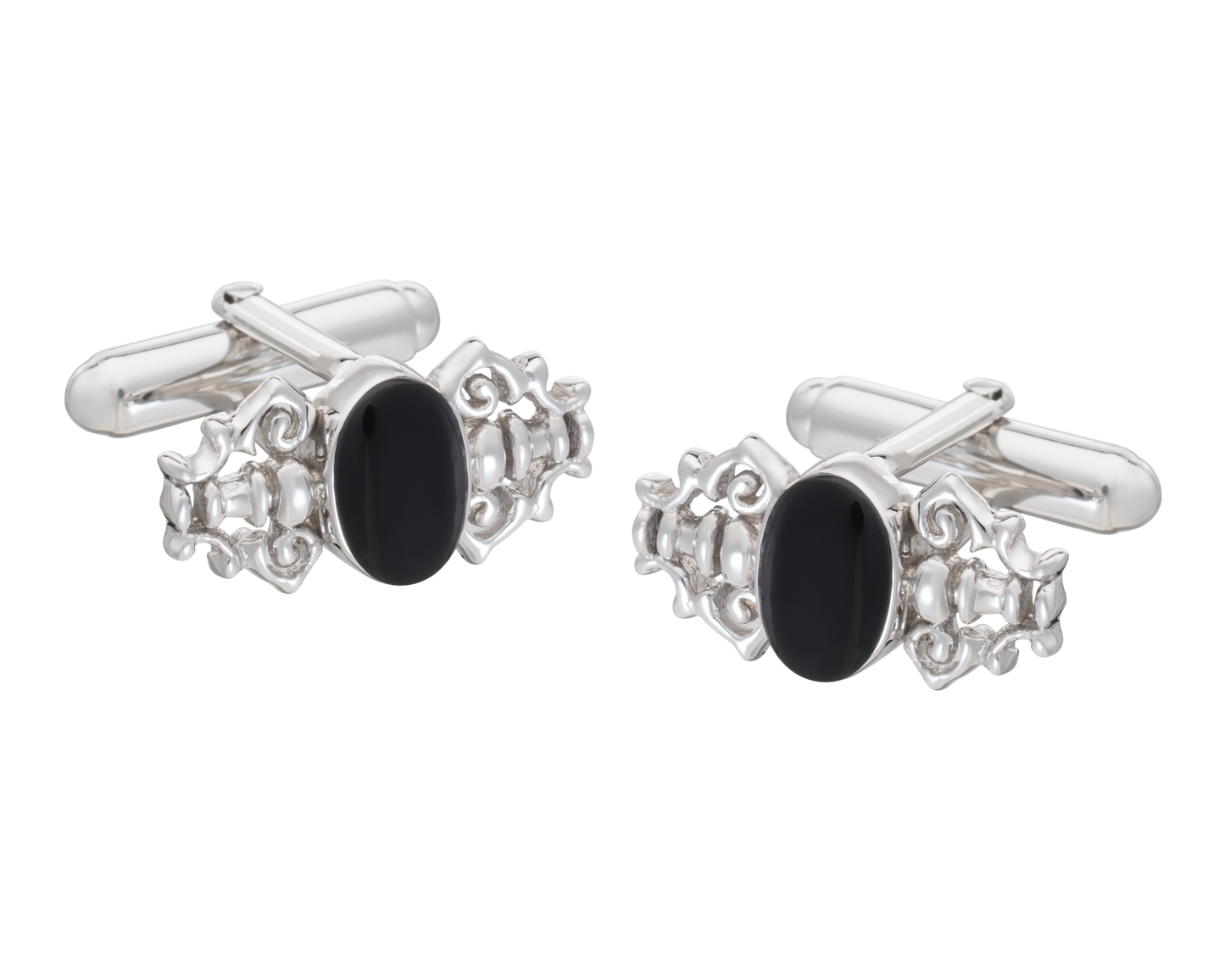 Influenced by the highly ornate and extravagant style of the baroque period these flamboyant cufflinks are work of art for the cuff. A smooth cabochon black onyx stone is flanked by intricate .925 sterling silver work to create a truly magnificent and majestic design. Perfect for adding a touch of luxury to an outfit.