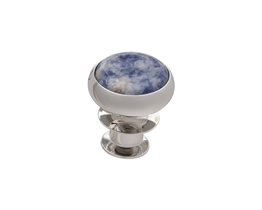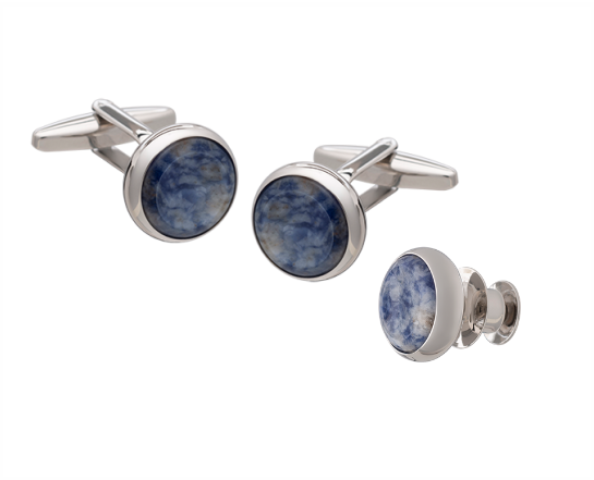 The Signature No6 Set includes a pair of cufflinks and a lapel pin with a delicate diameter of 14mm. Both feature a Stunning Blue Aventurine stone that protrudes from the edge of their silver casings, before dropping down to create a slight concave dip.